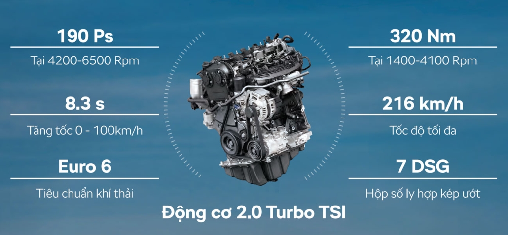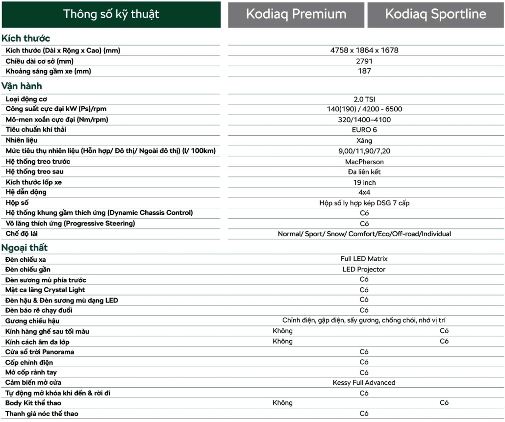 Kodiaq New Generation trang bị động cơ xăng 2.0L Turbo TSI sản sinh công suất 190 PS và mô-men xoắn 320 Nm, kết hợp hộp số DSG 7 cấp và hệ dẫn động 4×4 hiện đại. Đi cùng với 7 chế độ lái – từ Eco, Comfort, Normal, Sport đến Snow, Off-road và Individual – giúp cho xe có khả năng đảm bảo hiệu suất vận hành tối ưu trên mọi cung đường.